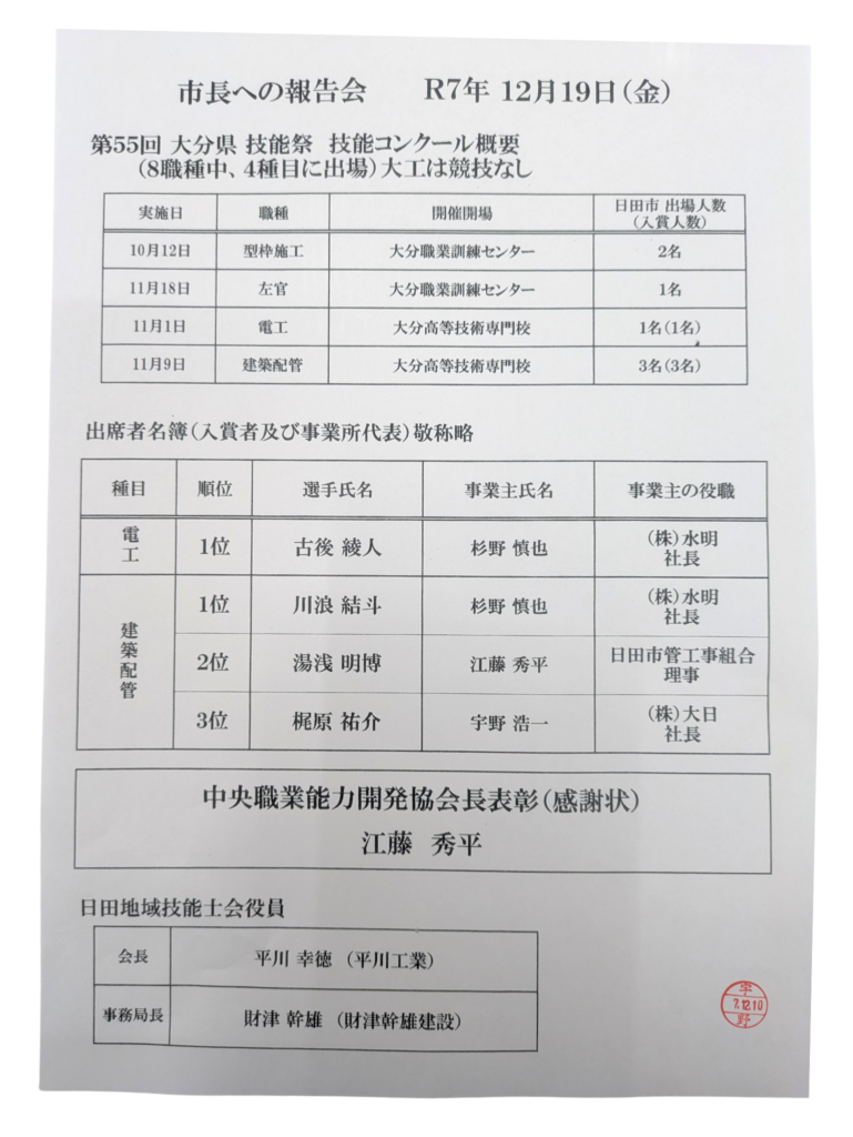 市長からは、若い技能者の活躍が地域のものづくりを支えていることへの期待と、今後への励ましのお言葉をいただき、改めて技術を磨き続けることの大切さを実感する機会となりました。